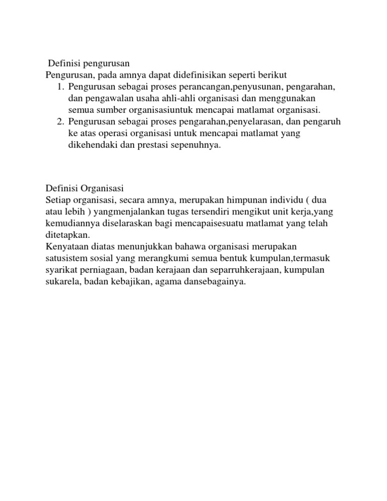 DEFINISI ORGANISASI Satu unit sosial yang terdiri daripada manusia yg bekerjasama saling bergantung antara satu sama lain bagi mencapai matlamat individu. Apa itu Pengurusan Perniagaan. Apa Itu Pengurusan Perniagaan - August 24 2022 Malaysia adalah sebuah Agensi Penyelaras Pusat yang bertanggungjawab menggubal dasar dan strategi menyeluruh untuk.
